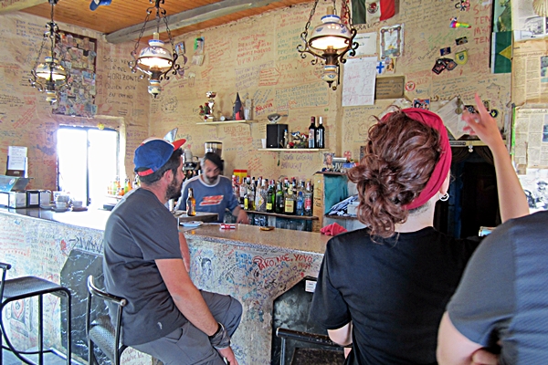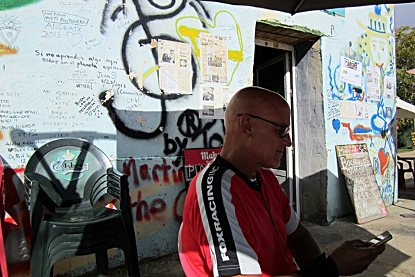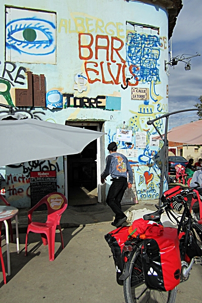 Auf dem Weg von Sahagún nach León Mittagspause in alternativem Ambiente und Wiedersehen mit alten Weggefährten: Reinald aus Zwolle in Holland. Drei Generationen-Unternehmen: Die Männer mit dem Rad, vorneweg oder hinterher zwei Frauen mit Auto. Reinald, der älteste im Verbund nimmt es locker. Wenn es zu lang wird, lässt er sich auflesen. Sie habe ich in Castrojeriz kennen gelernt. Paolo und Giorgio (zwei Fotos) sind die beiden aus Ligurien, die mir hinter Pamplona zum ersten Mal begegnet sind.