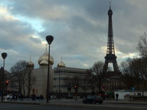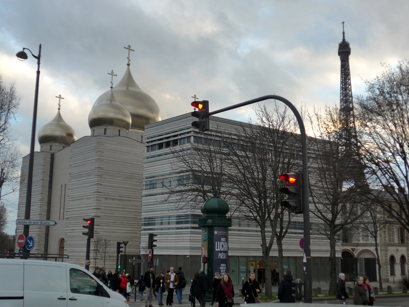Paris hat eine schöne russisch-orthodoxe Kirche in der Rue Daru, im achten Arrondissement. nicht weit vom Arc de Triomphe. Gegenüber das russische Restaurant A la Ville de Petrograd. Ein ruhiger Ort, den man finden muss. Jetzt gibt es eine neue, prominent untergebracht am Quai Branly, um die Ecke das ethnografische Museum und der Eiffelturm. Habe mich schon länger gewundert, warum es einer zweiten bedurfte. Gut, der Moskauer Patriarch steht auf Kriegsfuß mit seinem Kollegen, dem „Ökumenischen Patriarchen“ von Konstantinopel (sic!), dem die Kirche in der Rue Daru zugeordnet ist. Der Streit wird auch im Zentrum der Französischen Republik ausgetragen.